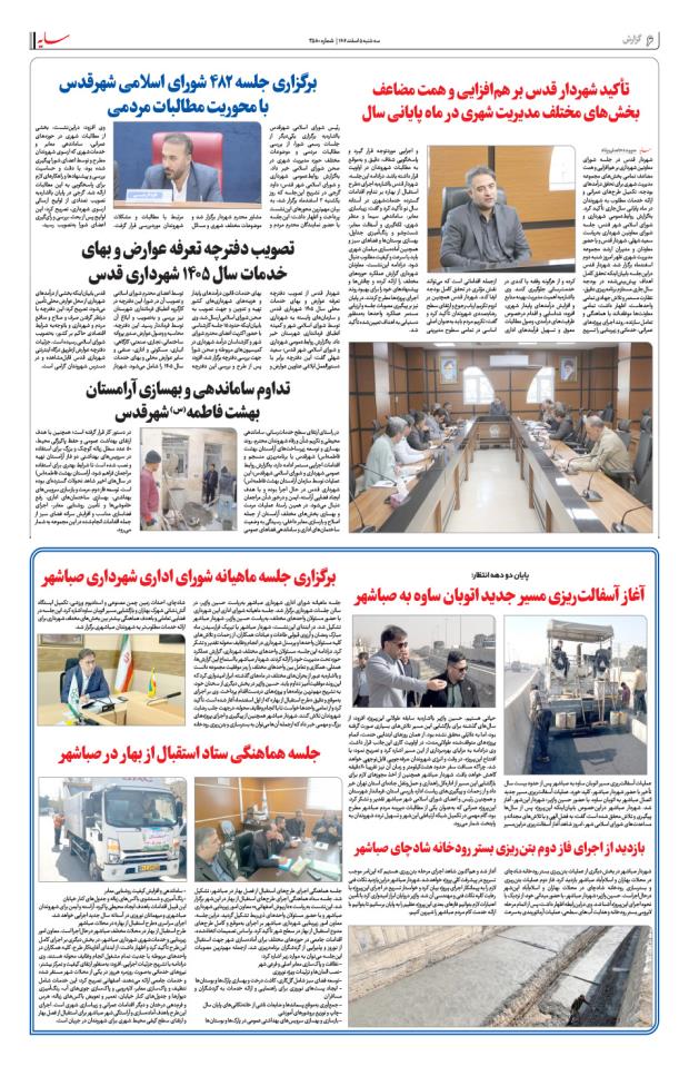 تأكید شهردار قدس بر هم‌افزایی و همت مضاعف بخش‌های مختلف مدیریت شهری در ماه پایانی سالبرگزاری جلسه ۴۸۲ شورای اسلامی شهرقدس با محوریت مطالبات مردمیتصویب دفترچه تعرفه عوارض و بهای خدمات سال ۱۴۰۵ شهرداری قدستداوم ساماندهی و بهسازی آرامستان بهشت فاطمه‌(س) شهرقدسآغاز آسفالت‌ریزی مسیر جدید اتوبان ساوه به صباشهربازدید از اجرای فاز دوم بتن‌ریزی بستر رودخانه شادچای صباشهربرگزاری جلسه ماهیانه شورای اداری شهرداری صباشهرجلسه هماهنگی ستاد استقبال از بهار در صباشهر